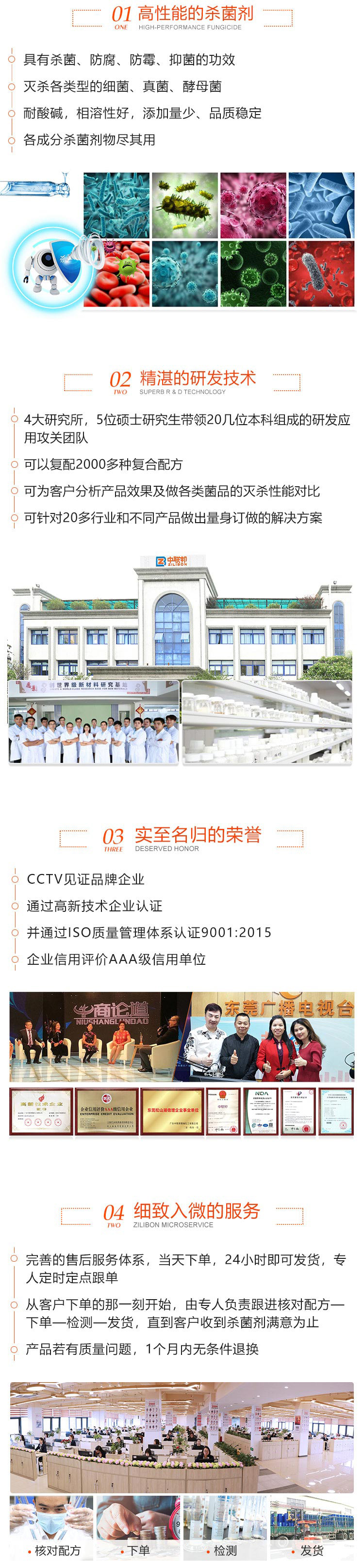 公司以科研技术领路,针对各成分杀菌剂的特点,进行复配研究,让各成分杀菌剂物尽其用,同时了解各行业的实际应用需求,针对20多行业和不同产品做出量身订做解决方案,让杀菌剂具有杀菌、防腐、防霉、抑菌等功效。中联邦杀菌剂获得了客户一致好评。